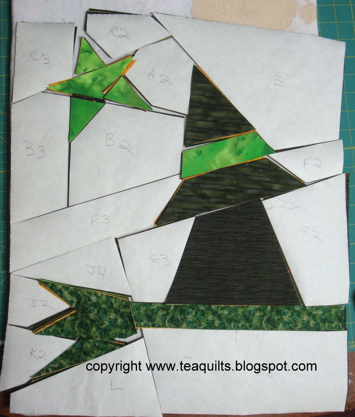 Even when you skip through the directions, you always have to come back to Step #1. I started sewing the sections together and got 9 of 10 of them sewn. You see, I skipped the first part of the directions as I new it would be tedious and I just wasn't in the mood. I need to make the withes' leg/shoe units. Now, whether I'm in the mood or not, now is the time. I have the legs all cut but need to go through my scraps to find more black fabrics for the shoes.