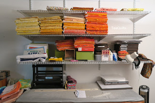 This photo is of my main working area for sorting out items and refolding my fabric stash. So far, I have refolded seven moving boxes; I have seven more in the garage. On the middle shelf, I will store yellows, oranges, and pinks. The mini bolts are two stacks deep. The stacks on top were improperly stored and are waiting to be put in their new homes.